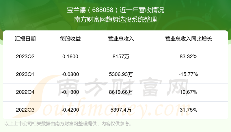 宝兰德2023年第二季度显示,公司主营收入8157万元,同比83.32%;归母净利润869.79万元,同比147.93%;扣非净利润571.18万元,同比128.18%;