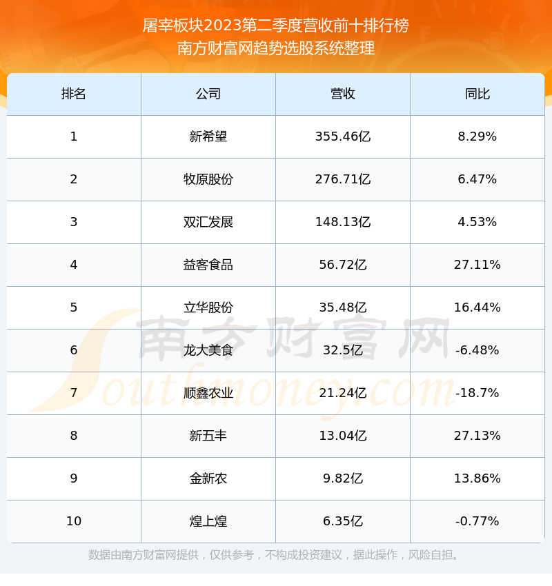 按照南方财富网趋势选股系统统计,该股所属板块为屠宰板块,该板块共有12只股票,新五丰2023第二季度营收在该板块中排名为第8名,该板块2023第二季度营收排名前十的股票如下表: