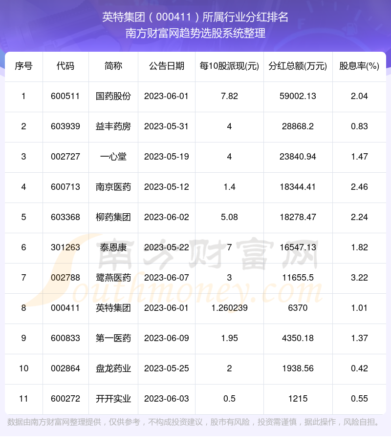 按照南方财富网趋势选股系统统计,英特集团所属行业为医药商业行业,医药商业行业分红排名情况如下表: