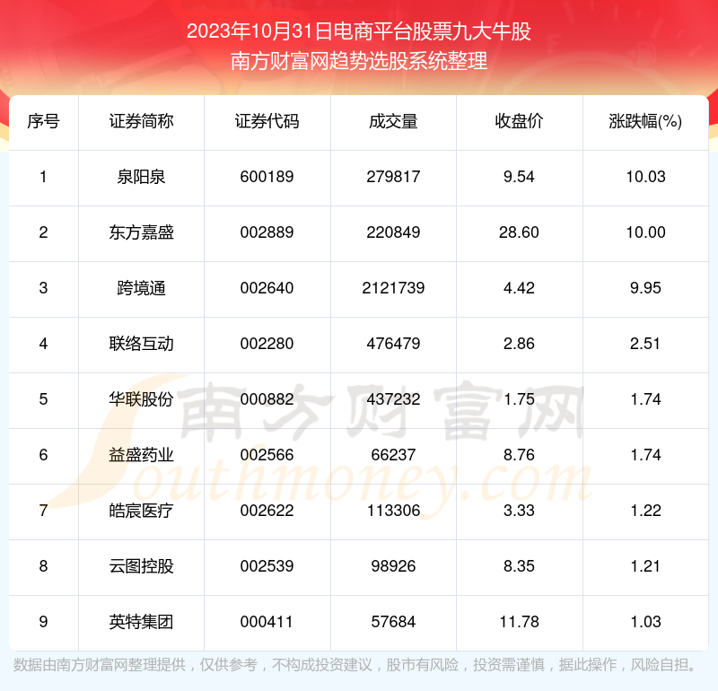 截止2023年10月31日,个股表现方面,电商平台股票当日领涨股为泉阳泉(600189),该股当日报收9.54,上涨10.03%,成交量27.98万。东方嘉盛(002889)以上涨10.00%紧随其后,该股当日成交量22.08万。此外,跨境通(002640)、联络互动(002280)、华联股份(000882)均进入当日电商平台股票牛股之列。