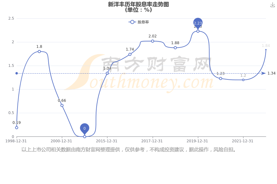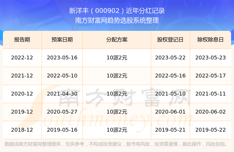 新洋丰最新一次公布的分红方案为10派2元。本次权益分派股权登记日为2023年5月22日,除权除息日为2023年5月23日,派息日为2023年5月23日。