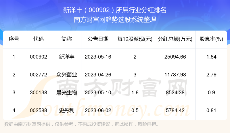 按照南方财富网趋势选股系统统计,新洋丰所属行业为复合肥行业,复合肥行业分红排名情况如下表: