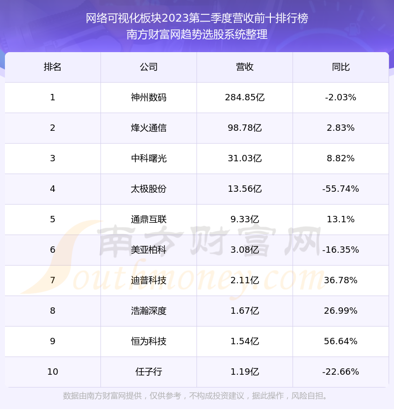按照南方财富网趋势选股系统统计,该股所属板块为网络可视化板块,该板块共有12只股票,恒为科技2023第二季度营收在该板块中排名为第9名,该板块2023第二季度营收排名前十的股票如下表: