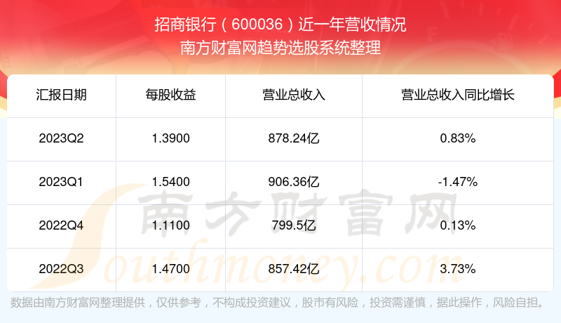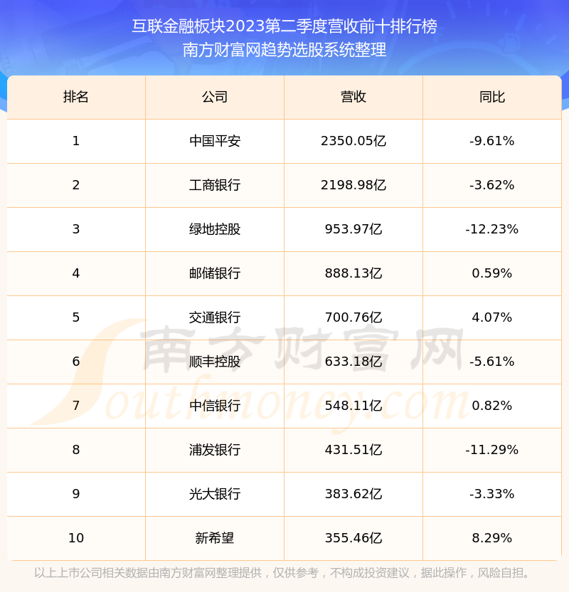 按照南方财富网趋势选股系统统计,该股所属板块为互联金融板块,该板块共有238只股票,招商银行2023第二季度营收在该板块中排名为第238名,该板块2023第二季度营收排名前十的股票如下表:
