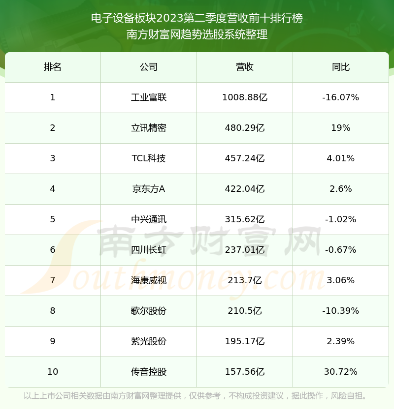 按照南方财富网趋势选股系统统计,该股所属板块为电子设备板块,该板块共有393只股票,广电网络2023第二季度营收在该板块中排名为第393名,该板块2023第二季度营收排名前十的股票如下表: