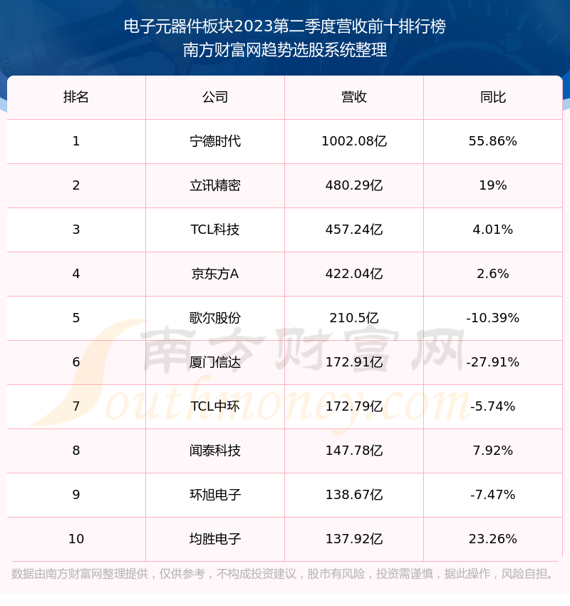 按照南方财富网趋势选股系统统计,该股所属板块为电子元器件板块,该板块共有154只股票,泰晶科技2023第二季度营收在该板块中排名为第123名,该板块2023第二季度营收排名前十的股票如下表: