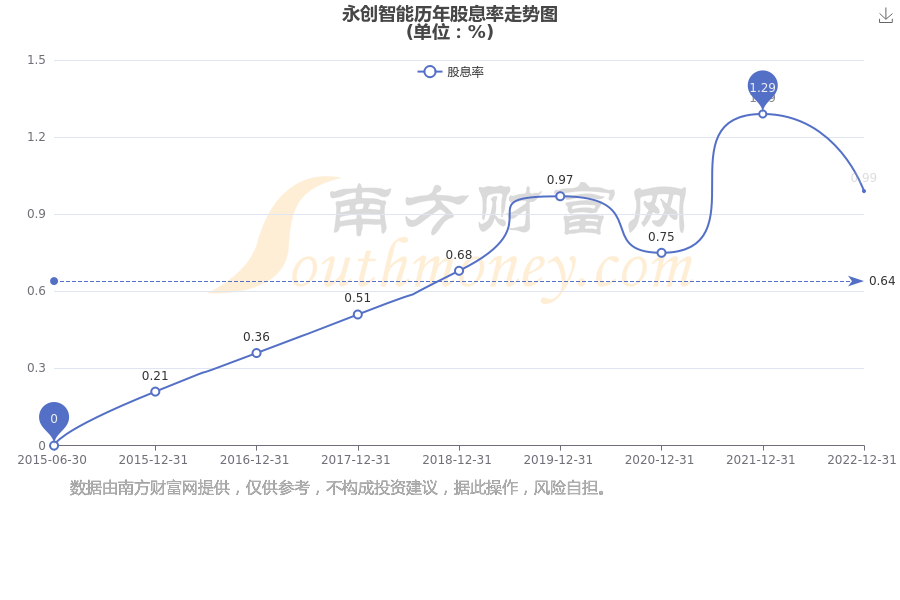 永创智能最新一次公布的分红方案为10派1.3元。本次权益分派股权登记日为2023年6月15日,除权除息日为2023年6月16日,派息日为2023年6月16日。