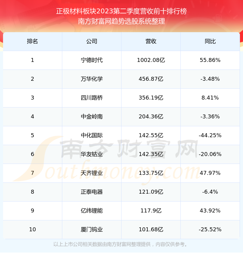 按照南方财富网趋势选股系统统计,该股所属板块为正极材料板块,该板块共有84只股票,振华新材2023第二季度营收在该板块中排名为第45名,该板块2023第二季度营收排名前十的股票如下表: