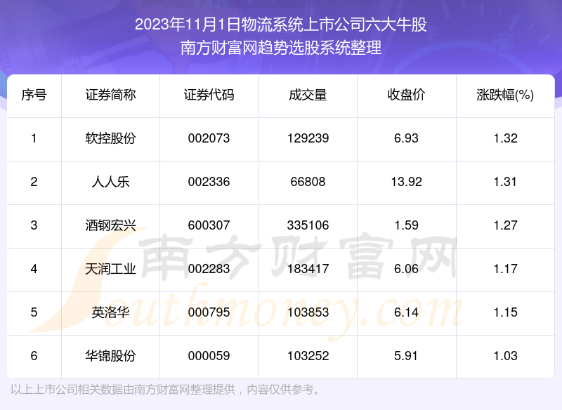 截止2023年11月1日,个股表现方面,物流系统上市公司当日领涨股为软控股份(002073),该股当日报收6.93,上涨1.32%,成交量12.92万。人人乐(002336)以上涨1.31%紧随其后,该股当日成交量6.68万。此外,酒钢宏兴(600307)、天润工业(002283)、英洛华(000795)均进入当日物流系统上市公司牛股之列。