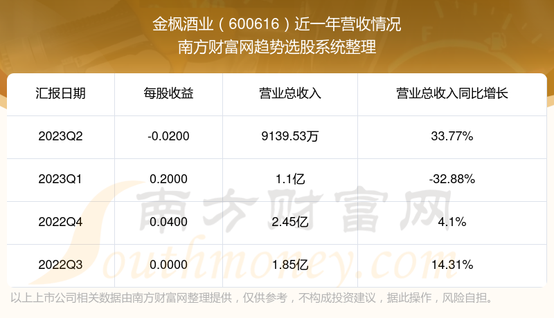 财报显示,2023年第二季度金枫酒业营收9139.53万元,同比增长33.77%,净利润-1548.37万元,同比增长33.72%。