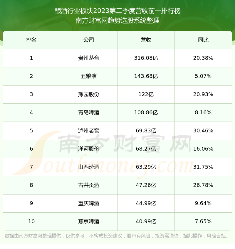 按照南方财富网趋势选股系统统计,该股所属板块为酿酒行业板块,该板块共有42只股票,金枫酒业2023第二季度营收在该板块中排名为第36名,该板块2023第二季度营收排名前十的股票如下表: