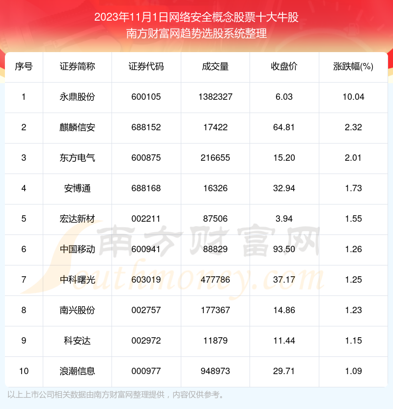 截止2023年11月1日,个股表现方面,网络安全概念股票当日领涨股为永鼎股份(600105),该股当日报收6.03,上涨10.04%,成交量138.23万。麒麟信安(688152)以上涨2.32%紧随其后,该股当日成交量1.74万。此外,东方电气(600875)、安博通(688168)、宏达新材(002211)均进入当日网络安全概念股票牛股之列。