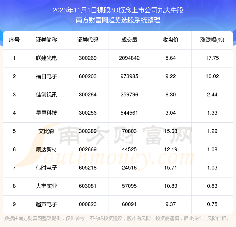 截止2023年11月1日,个股表现方面,裸眼3D概念上市公司当日领涨股为联建光电(300269),该股当日报收5.64,上涨17.75%,成交量209.48万。福日电子(600203)以上涨10.02%紧随其后,该股当日成交量97.4万。此外,佳创视讯(300264)、星星科技(300256)、艾比森(300389)均进入当日裸眼3D概念上市公司牛股之列。