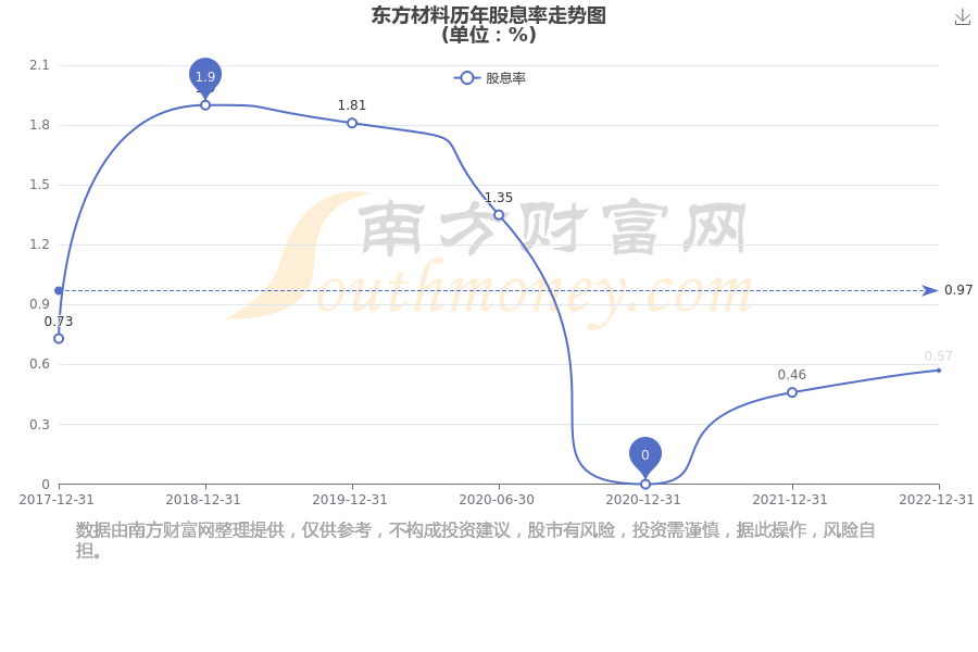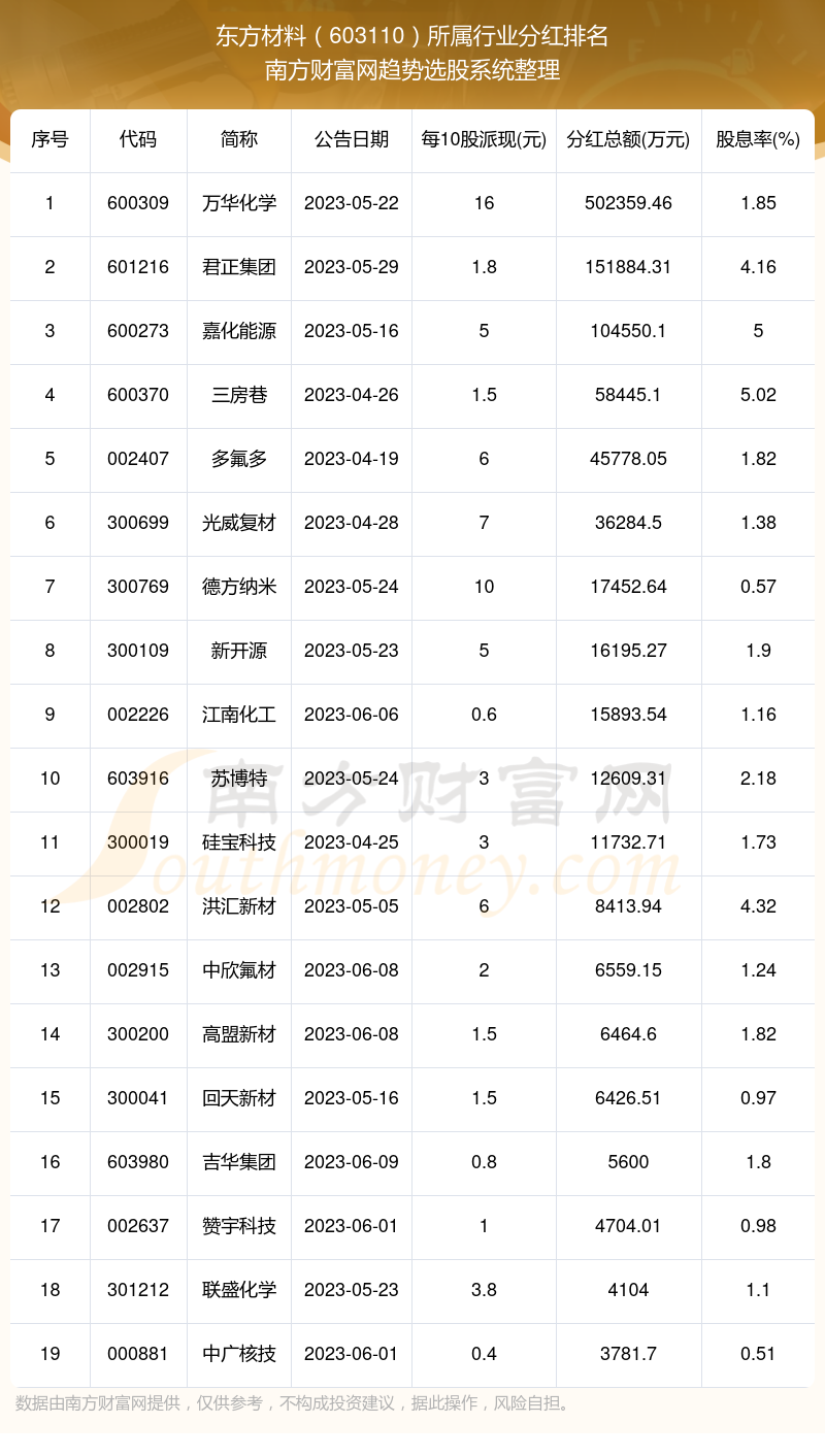 按照南方财富网趋势选股系统统计,东方材料所属行业为化学制品行业,化学制品行业分红排名情况如下表: