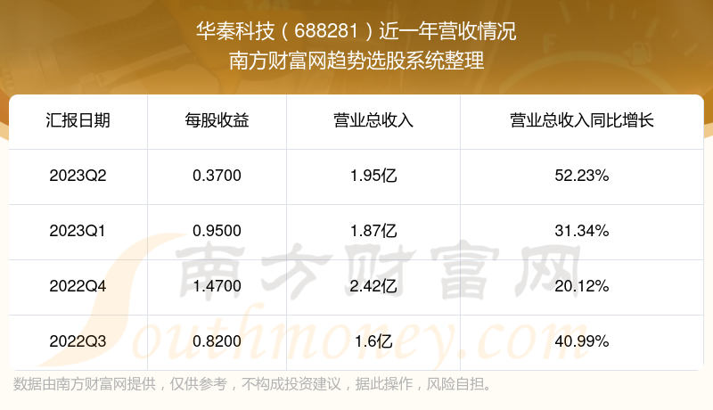 华秦科技发布2023年第二季度财报。实现总营收1.95亿元,同比增长52.23%;扣非净利润同比增长47.08%至8810.23万元。