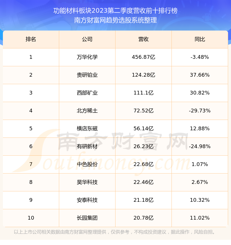 按照南方财富网趋势选股系统统计,该股所属板块为功能材料板块,该板块共有27只股票,华秦科技2023第二季度营收在该板块中排名为第27名,该板块2023第二季度营收排名前十的股票如下表: