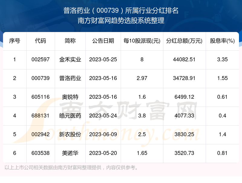 按照南方财富网趋势选股系统统计,普洛药业所属行业为原料药行业,原料药行业分红排名情况如下表: