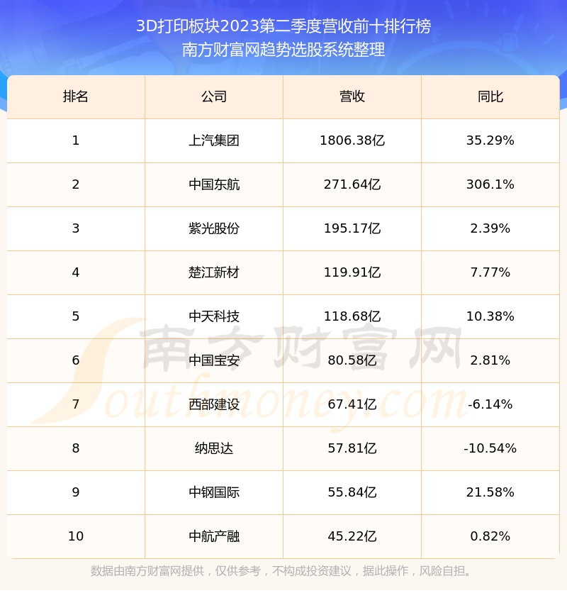 按照南方财富网趋势选股系统统计,该股所属板块为3D打印板块,该板块共有98只股票,铂力特2023第二季度营收在该板块中排名为第63名,该板块2023第二季度营收排名前十的股票如下表: