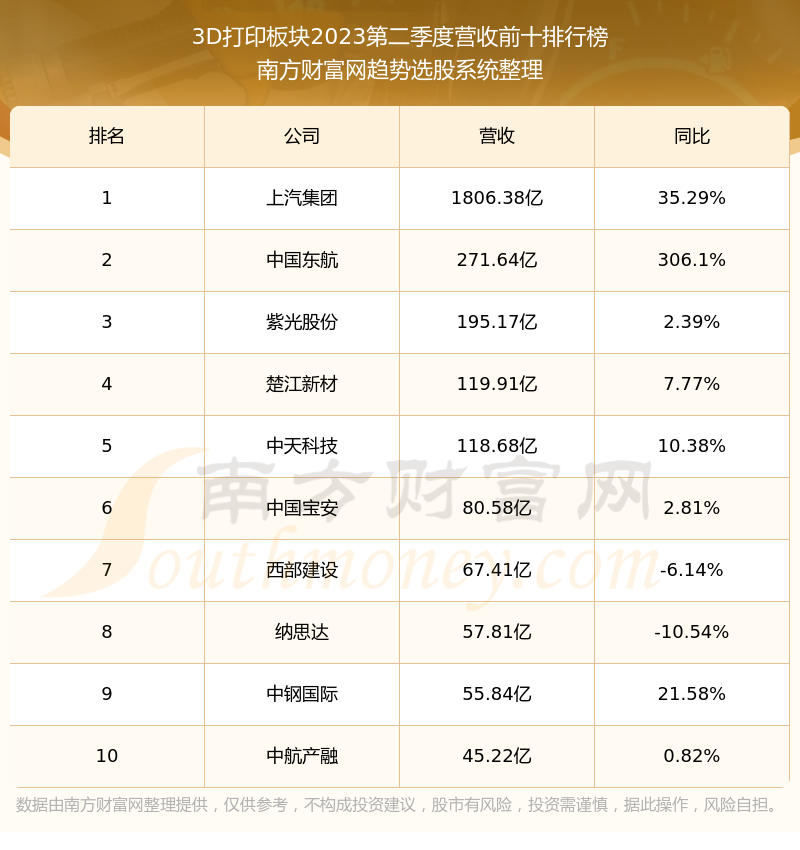 按照南方财富网趋势选股系统统计,该股所属板块为3D打印板块,该板块共有98只股票,华曙高科2023第二季度营收在该板块中排名为第81名,该板块2023第二季度营收排名前十的股票如下表: