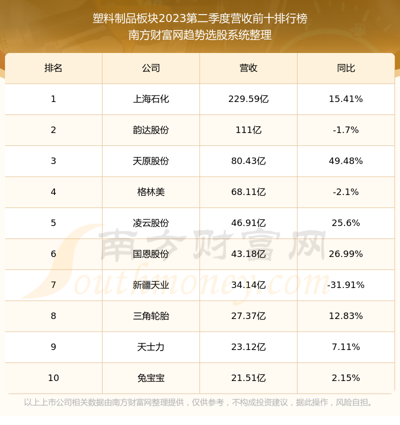 按照南方财富网趋势选股系统统计,该股所属板块为塑料制品板块,该板块共有71只股票,艾艾精工2023第二季度营收在该板块中排名为第71名,该板块2023第二季度营收排名前十的股票如下表: