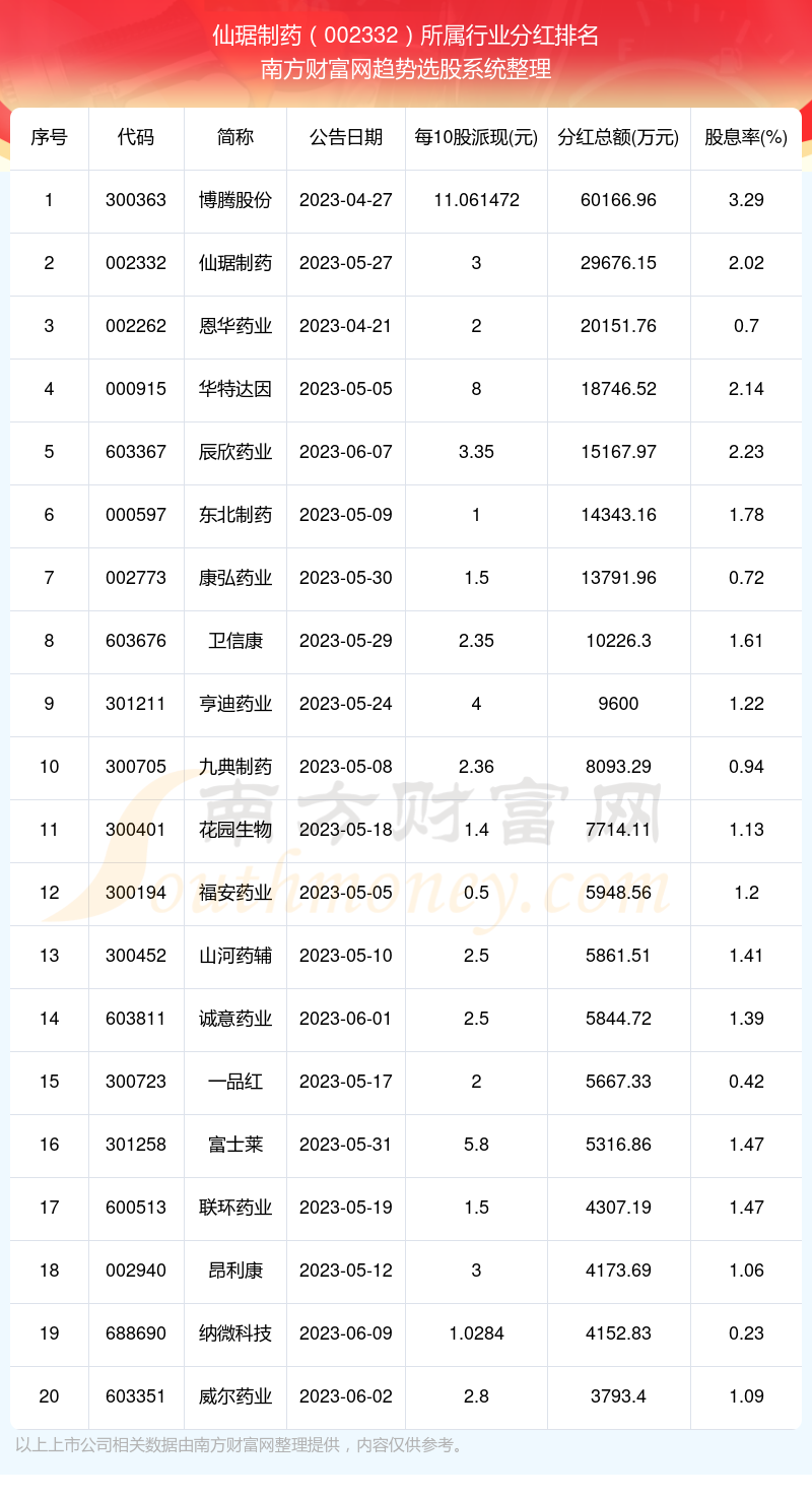 二、仙琚制药002332行业分红排名