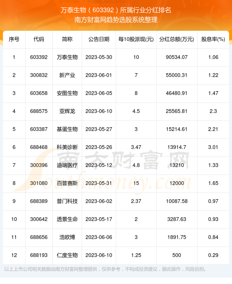 按照南方财富网趋势选股系统统计,万泰生物所属行业为疫苗行业,疫苗行业分红排名情况如下表: