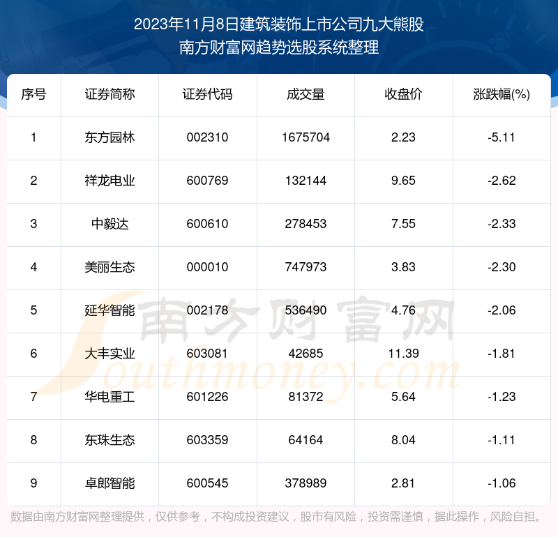 截止2023年11月8日,个股表现方面,建筑装饰上市公司当日领跌股为东方园林(002310),该股当日报收2.23,上涨-5.11%,成交量167.57万。祥龙电业(600769)以下跌-2.62%紧随其后,该股当日成交量13.21万。此外,中毅达(600610)、美丽生态(000010)、延华智能(002178)均进入当日建筑装饰上市公司熊股之列。