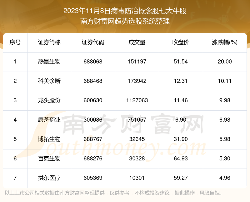 截止2023年11月8日,个股表现方面,病毒防治概念股当日领涨股为热景生物(688068),该股当日报收51.54,上涨20.00%,成交量15.12万。科美诊断(688468)以上涨10.11%紧随其后,该股当日成交量17.39万。此外,龙头股份(600630)、康芝药业(300086)、博拓生物(688767)均进入当日病毒防治概念股牛股之列。