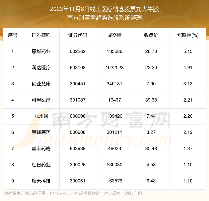 截止2023年11月8日,个股表现方面,线上医疗概念股票当日领涨股为恩华药业(002262),该股当日报收26.73,上涨5.15%,成交量13.56万。润达医疗(603108)以上涨4.91%紧随其后,该股当日成交量102.25万。此外,创业慧康(300451)、可孚医疗(301087)、九州通(600998)均进入当日线上医疗概念股票牛股之列。