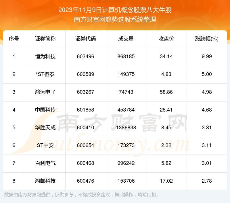 截止2023年11月9日,个股表现方面,计算机概念股票当日领涨股为恒为科技(603496),该股当日报收34.14,上涨9.99%,成交量86.82万。*ST榕泰(600589)以上涨5.00%紧随其后,该股当日成交量14.94万。此外,鸿远电子(603267)、中国科传(601858)、华胜天成(600410)均进入当日计算机概念股票牛股之列。