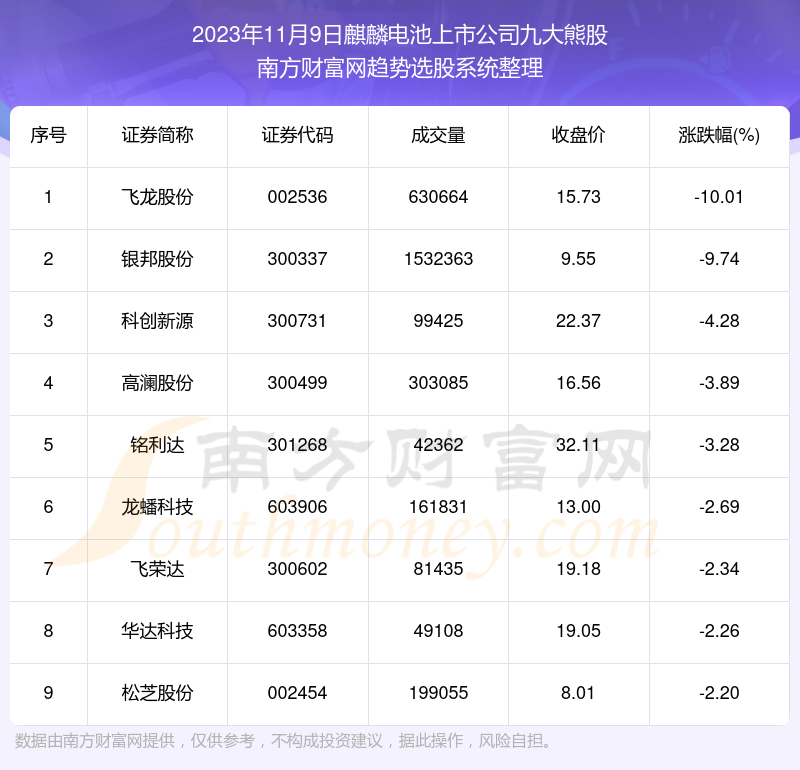 截止2023年11月9日,个股表现方面,麒麟电池上市公司当日领跌股为飞龙股份(002536),该股当日报收15.73,上涨-10.01%,成交量63.07万。银邦股份(300337)以下跌-9.74%紧随其后,该股当日成交量153.24万。此外,科创新源(300731)、高澜股份(300499)、铭利达(301268)均进入当日麒麟电池上市公司熊股之列。