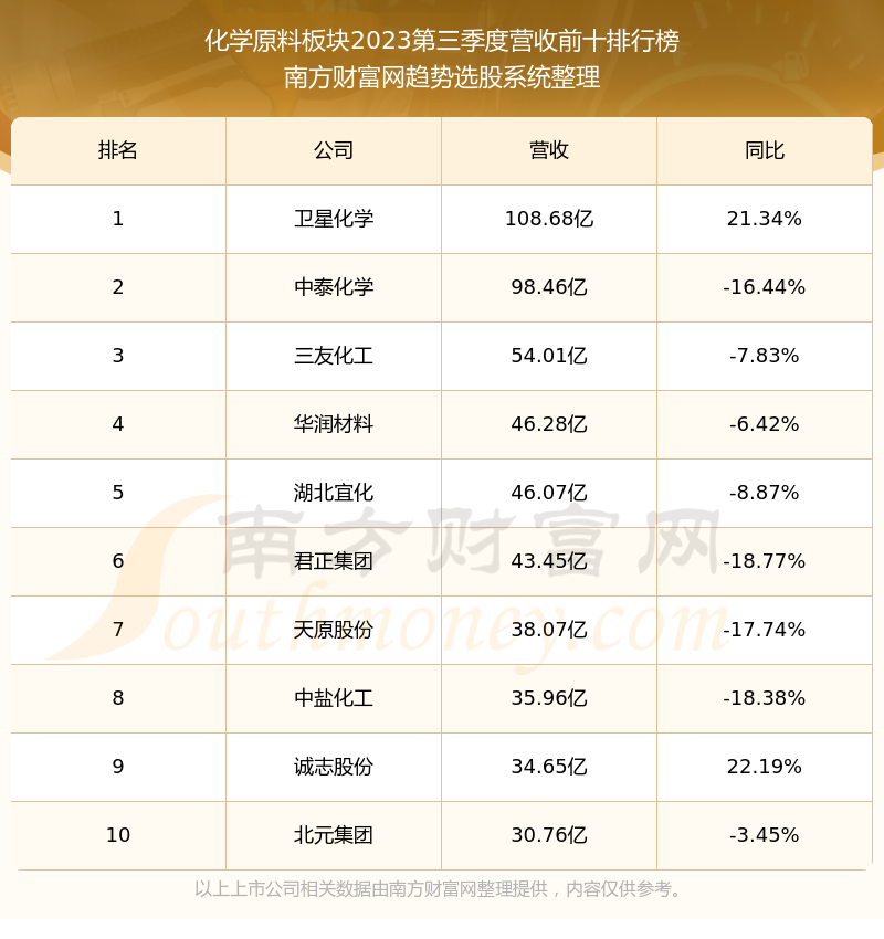 按照南方财富网趋势选股系统统计,该股所属板块为化学原料板块,该板块共有66只股票,三友化工2023第三季度营收在该板块中排名为第3名,该板块2023第三季度营收排名前十的股票如下表: