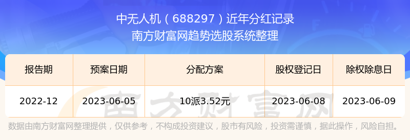 中无人机最新一次公布的分红方案为10派3.52元。本次权益分派股权登记日为2023年6月8日,除权除息日为2023年6月9日,派息日为2023年6月9日。