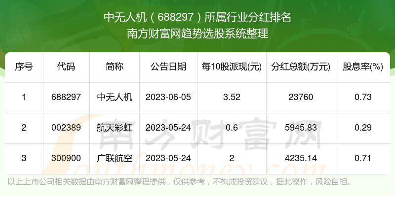 按照南方财富网趋势选股系统统计,中无人机所属行业为无人机行业,无人机行业分红排名情况如下表: