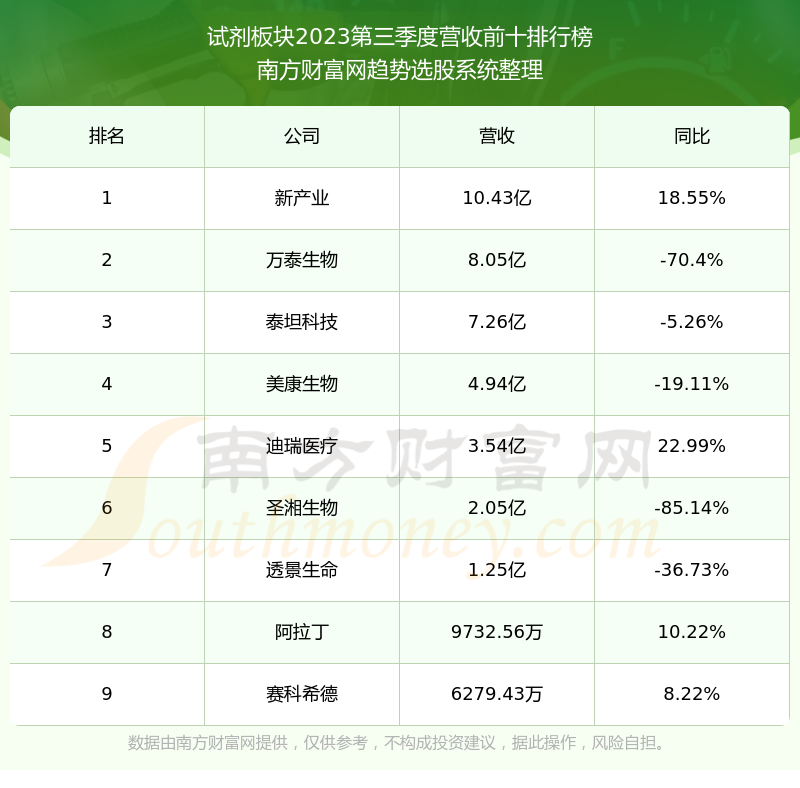 按照南方财富网趋势选股系统统计,该股所属板块为试剂板块,该板块共有9只股票,亚辉龙2023第三季度营收在该板块中排名为第9名,该板块2023第三季度营收排名前十的股票如下表: