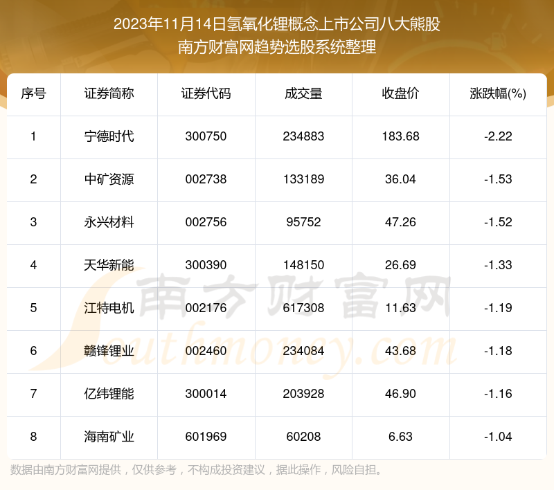 以上就是网络对牛弘配资 2023年11月14日板块数据:氢氧化锂概念上市公司八大熊股的解读(https://www.youge168.com/news-pzhq/50036.html)希望可以帮助您。