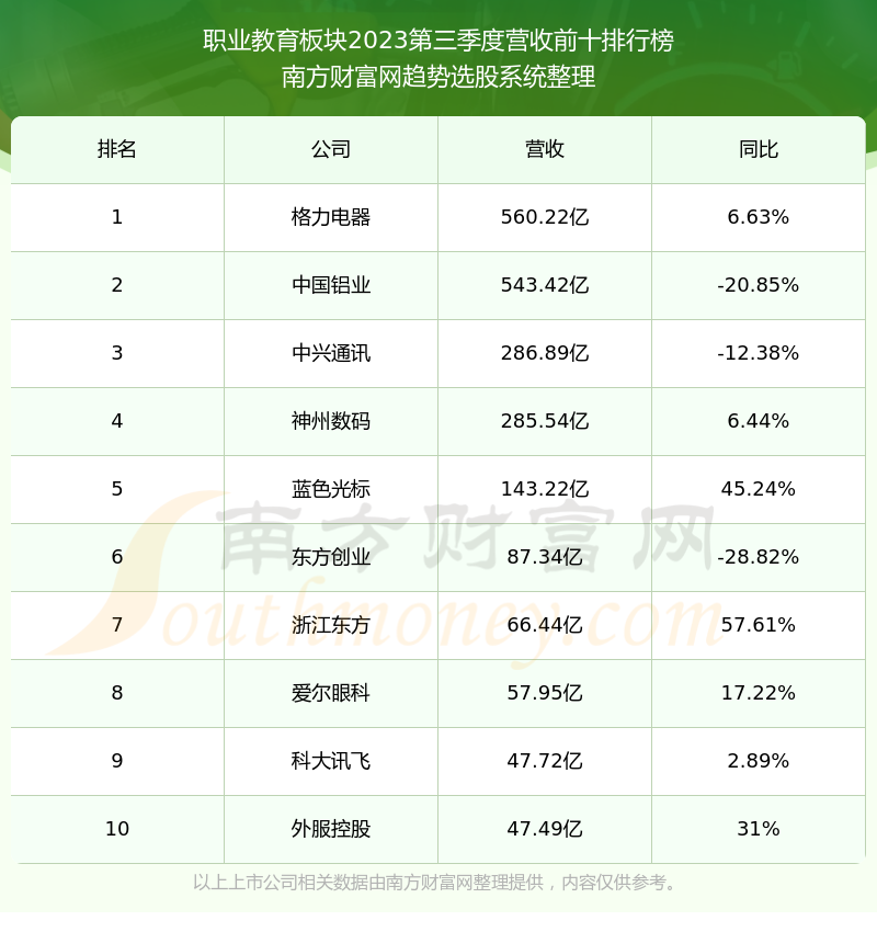 按照南方财富网趋势选股系统统计,该股所属板块为职业教育板块,该板块共有106只股票,东方时尚2023第三季度营收在该板块中排名为第58名,该板块2023第三季度营收排名前十的股票如下表:
