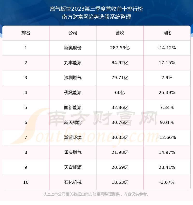 按照南方财富网趋势选股系统统计,该股所属板块为燃气板块,该板块共有36只股票,长春燃气2023第三季度营收在该板块中排名为第29名,该板块2023第三季度营收排名前十的股票如下表: