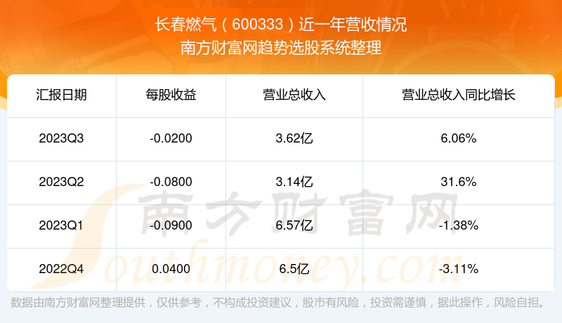 长春燃气披露了2023年第三季度财报。报告显示,长春燃气2023年第三季度实现营收3.62亿元,同比6.06%;归母净利润-775.66万元,同比53.59%。