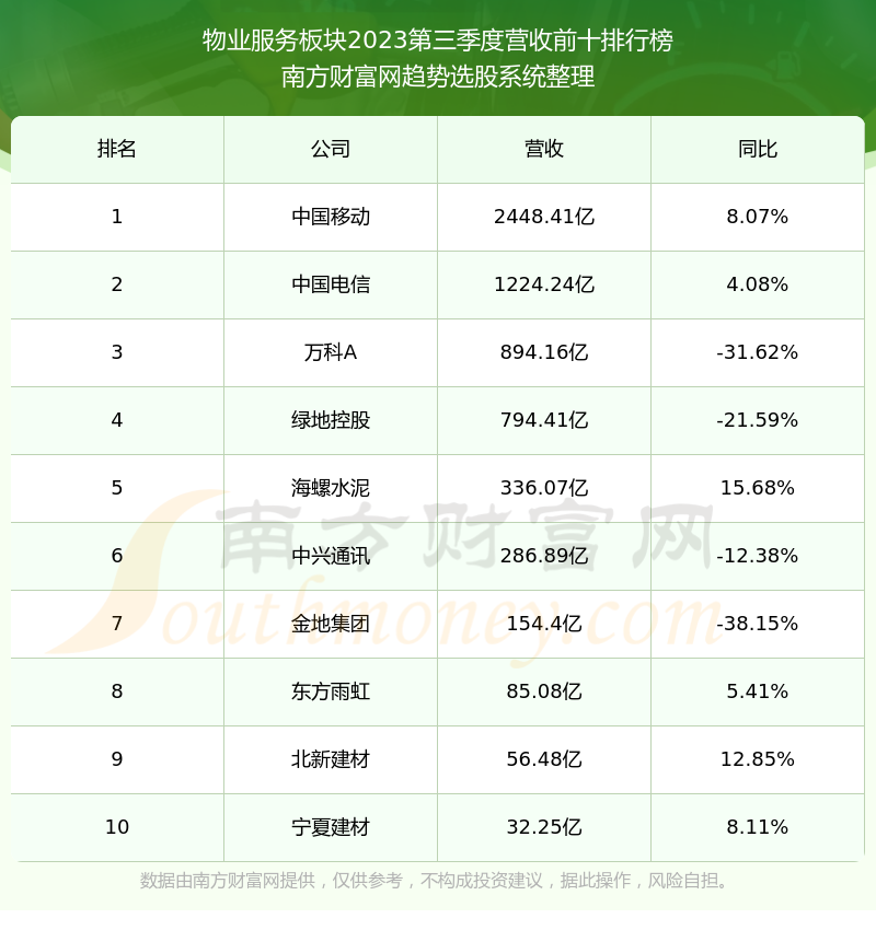 按照南方财富网趋势选股系统统计,该股所属板块为物业服务板块,该板块共有21只股票,锦和商管2023第三季度营收在该板块中排名为第18名,该板块2023第三季度营收排名前十的股票如下表: