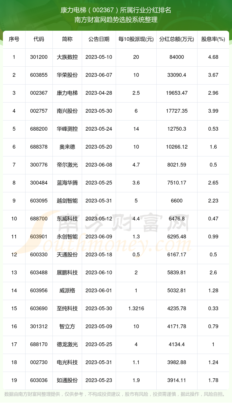 按照南方财富网趋势选股系统统计,康力电梯所属行业为电梯行业,电梯行业分红排名情况如下表: