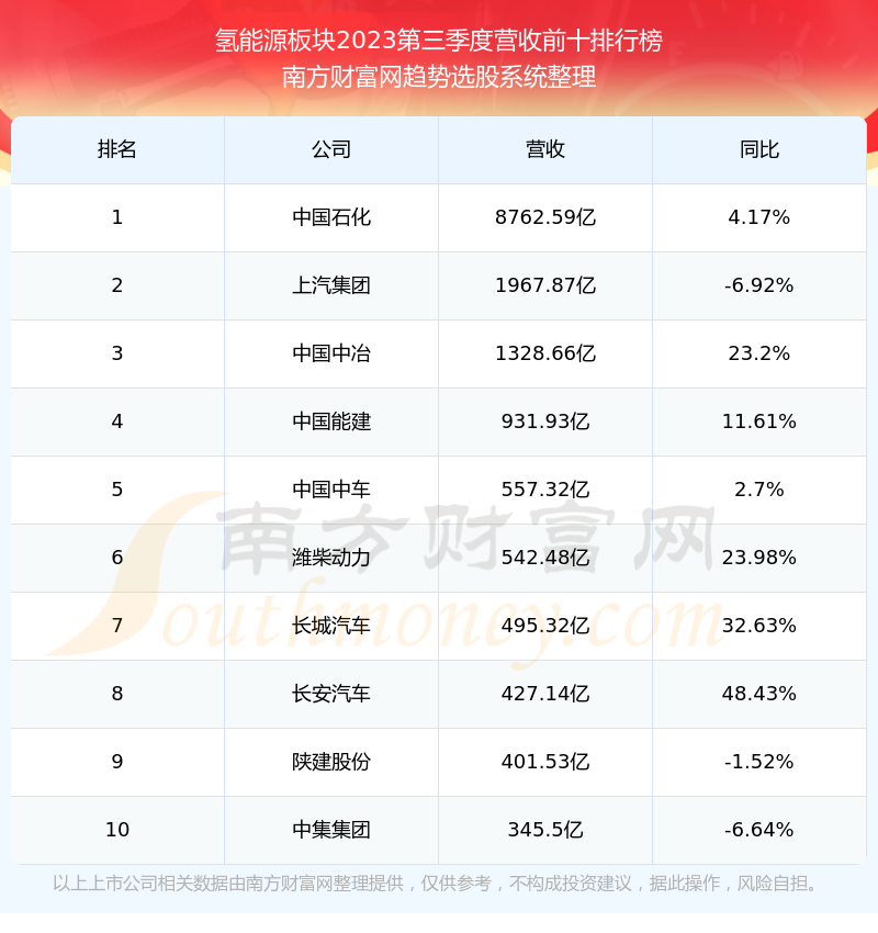按照南方财富网趋势选股系统统计,该股所属板块为氢能源板块,该板块共有283只股票,华电重工2023第三季度营收在该板块中排名为第110名,该板块2023第三季度营收排名前十的股票如下表: