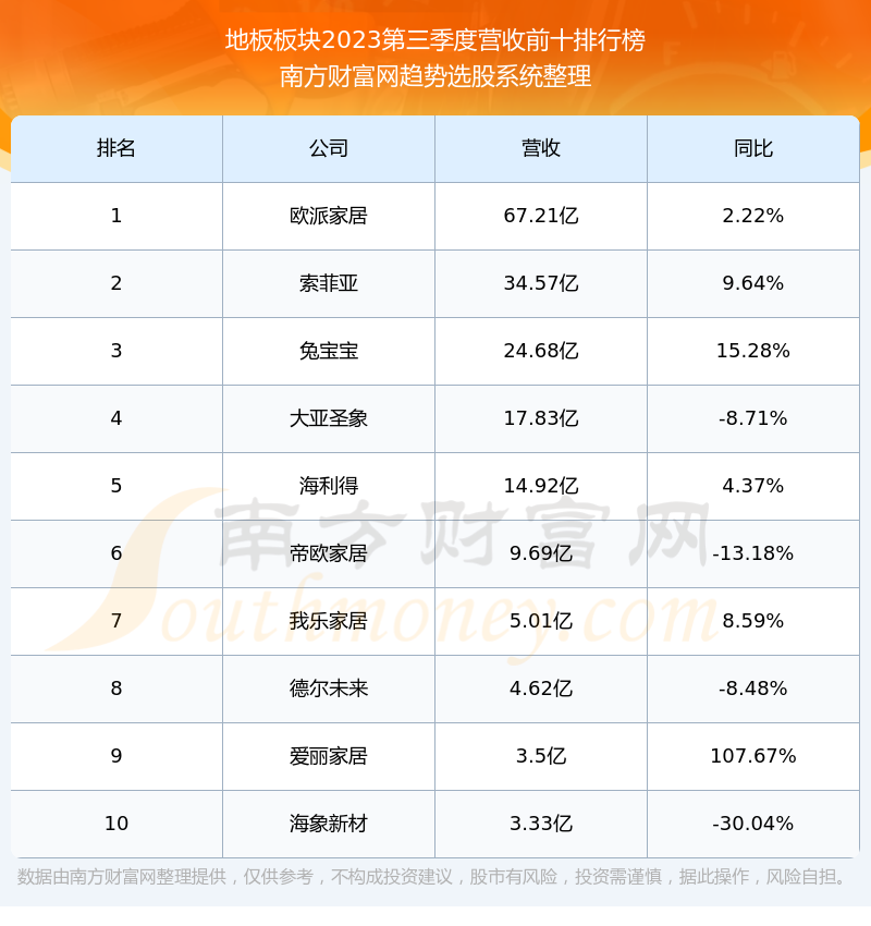 按照南方财富网趋势选股系统统计,该股所属板块为地板板块,该板块共有11只股票,爱丽家居2023第三季度营收在该板块中排名为第9名,该板块2023第三季度营收排名前十的股票如下表: