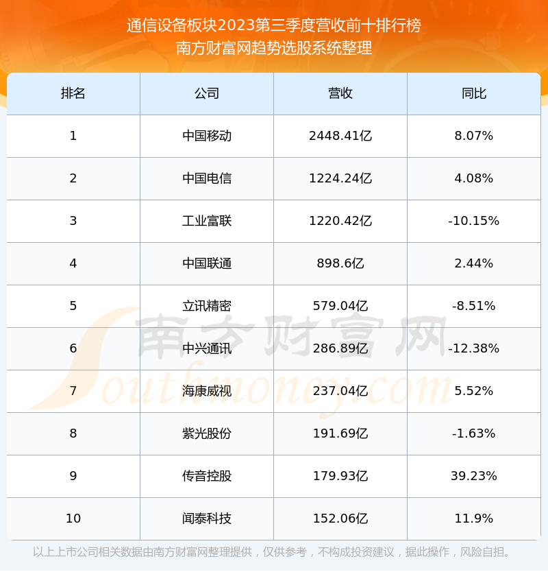 按照南方财富网趋势选股系统统计,该股所属板块为通信设备板块,该板块共有140只股票,高凌信息2023第三季度营收在该板块中排名为第134名,该板块2023第三季度营收排名前十的股票如下表: