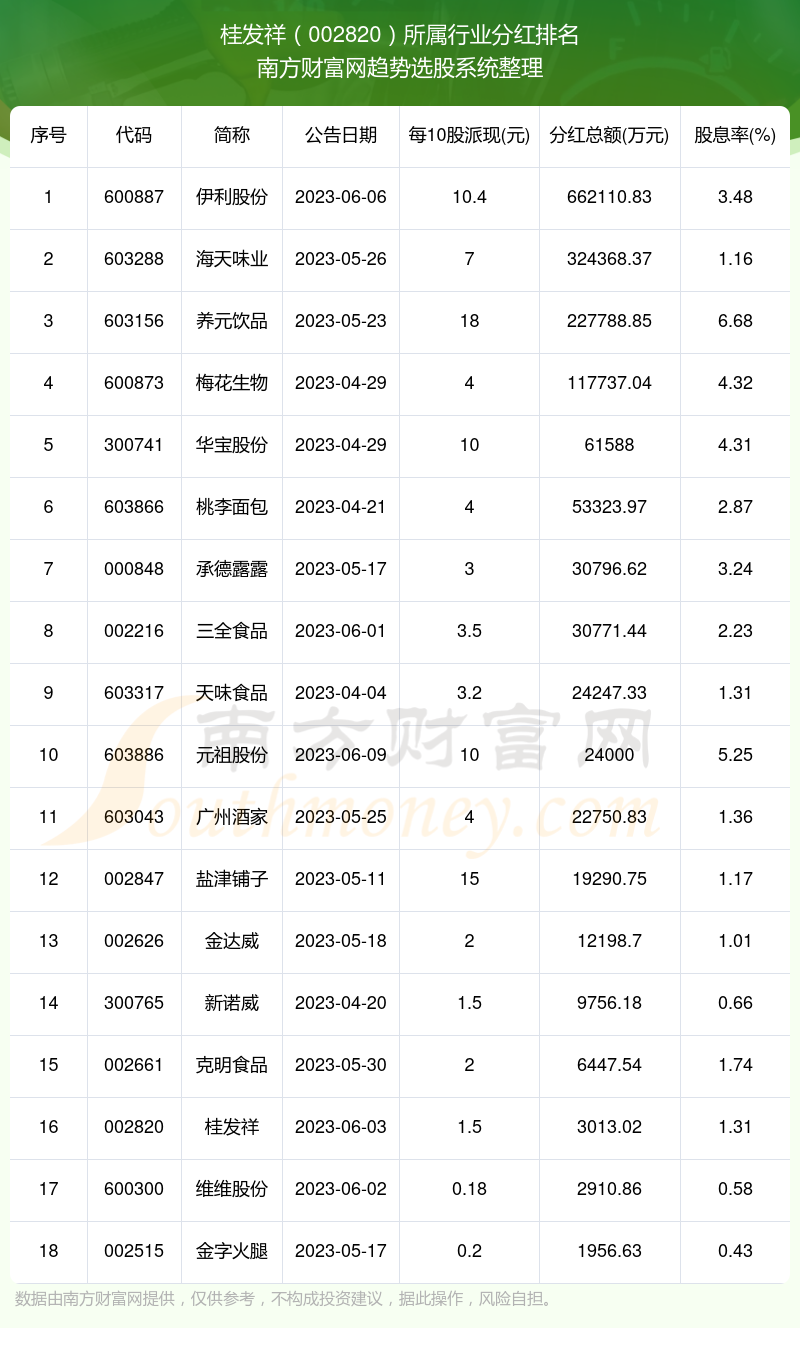 按照南方财富网趋势选股系统统计,桂发祥所属行业为食品饮料行业,食品饮料行业分红排名情况如下表: