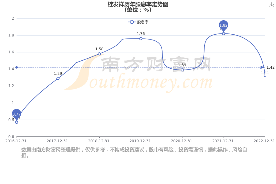 桂发祥最新一次公布的分红方案为10派1.5元。本次权益分派股权登记日为2023年6月8日,除权除息日为2023年6月9日,派息日为2023年6月9日。