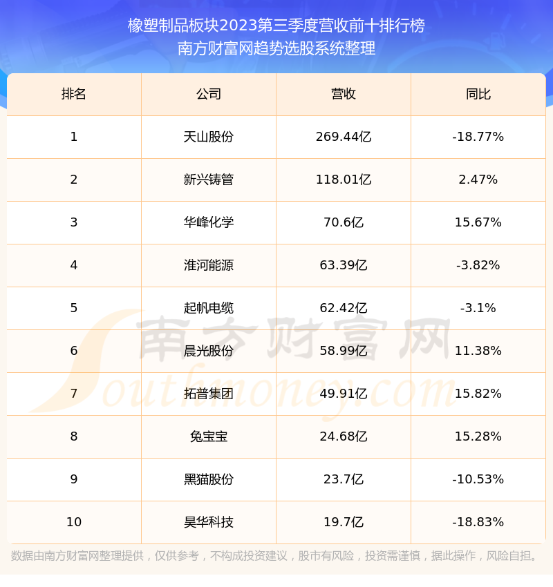按照南方财富网趋势选股系统统计,该股所属板块为橡塑制品板块,该板块共有23只股票,泛亚微透2023第三季度营收在该板块中排名为第19名,该板块2023第三季度营收排名前十的股票如下表: