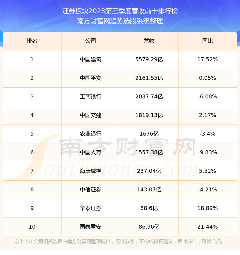 按照南方财富网趋势选股系统统计,该股所属板块为证券板块,该板块共有66只股票,湘财股份2023第三季度营收在该板块中排名为第47名,该板块2023第三季度营收排名前十的股票如下表: