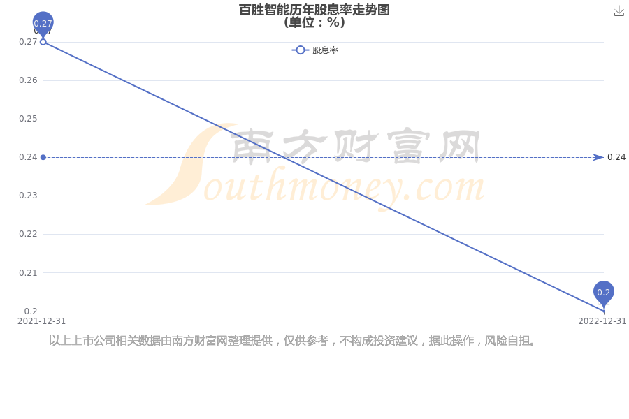 百胜智能最新一次公布的分红方案为10派0.35元。本次权益分派股权登记日为2023年5月23日,除权除息日为2023年5月24日,派息日为2023年5月24日。