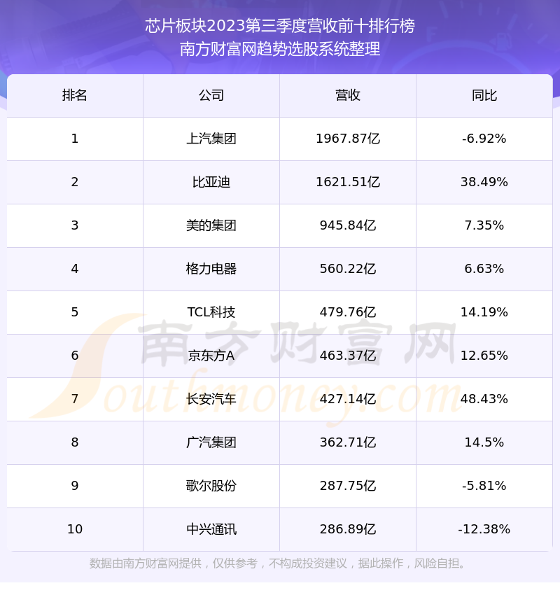 按照南方财富网趋势选股系统统计,该股所属板块为芯片板块,该板块共有511只股票,龙芯中科2023第三季度营收在该板块中排名为第471名,该板块2023第三季度营收排名前十的股票如下表: